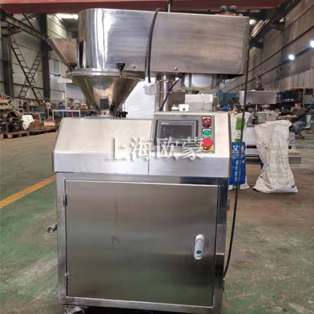本機(jī)有送料機(jī)構(gòu)、壓片機(jī)構(gòu)、液壓機(jī)構(gòu)、機(jī)架和電氣控制等部件組成,送料,壓片、制粒均采用變頻無級調(diào)速,油泵壓力可調(diào),成品細(xì)度可以通過更換不同的篩網(wǎng)獲得。改進(jìn)制粒轉(zhuǎn)籠,增加了顆粒的成品率。本機(jī)裝拆、清洗方便,與物料接觸部分皆為不銹鋼制作。產(chǎn)品符合GMP要求。物料由頂部送料漏斗加入,經(jīng)兩壓輪強(qiáng)制擠壓成片狀后進(jìn)入下部制粒室,在制粒室中片狀物料被制粒刀片打碎,然后進(jìn)入整粒室,直至顆粒小于或等于網(wǎng)孔徑,顆粒通過網(wǎng)篩到盛料托盤。所需要顆粒大小可以通過調(diào)整篩網(wǎng)大小來決定。